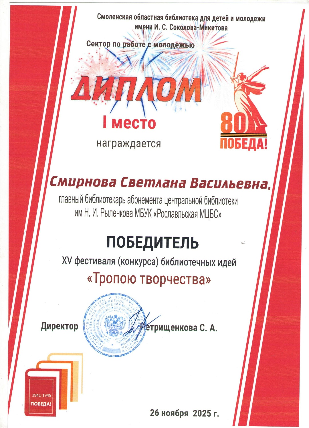 СМИРНОВОЙ СВЕТЛАНЕ ВАСИЛЬЕВНЕ, главному библиотекарю Центральной библиотеки им. Н. И. Рыленкова МБУК «Рославльская МЦБС» присуждено 1 МЕСТО.
