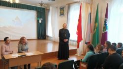 Перед участниками встречи выступил настоятель Церкви Рождества Пресвятой Богородицы, протоиерей о. Михаил (Гольцман). Священник в форме диалога поговорил с ребятами о важности посещения храма. На простых и ярких примерах он объяснил присутствующим православное понимание извечных вопросов человеческого бытия: что есть добро и зло, что такое нравственные ориентиры, какую роль они играют в жизни каждого человека.