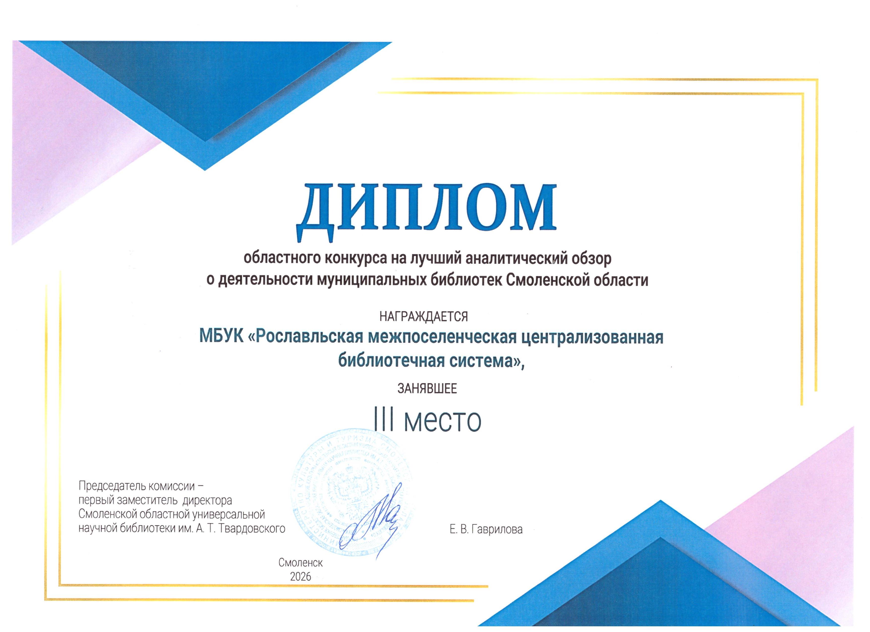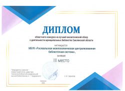 Диплом 3 место присужден МБУК «Рославльская межпоселенческая централизованная библиотечная система».