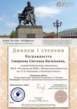 СМИРНОВОЙ СВЕТЛАНЕ ВАСИЛЬЕВНЕ, главному библиотекарю Центральной библиотеки им. Н. И. Рыленкова МБУК «Рославльская МЦБС» присуждено 1 МЕСТО.