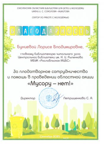МБУК «Рославльская МЦБС» было вручено Благодарственное письмо от Главы муниципального образования «Шумячский район» Д. А. Каменева.