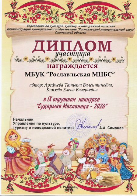 СМИРНОВОЙ СВЕТЛАНЕ ВАСИЛЬЕВНЕ, главному библиотекарю Центральной библиотеки им. Н. И. Рыленкова МБУК «Рославльская МЦБС» присуждено 1 МЕСТО.